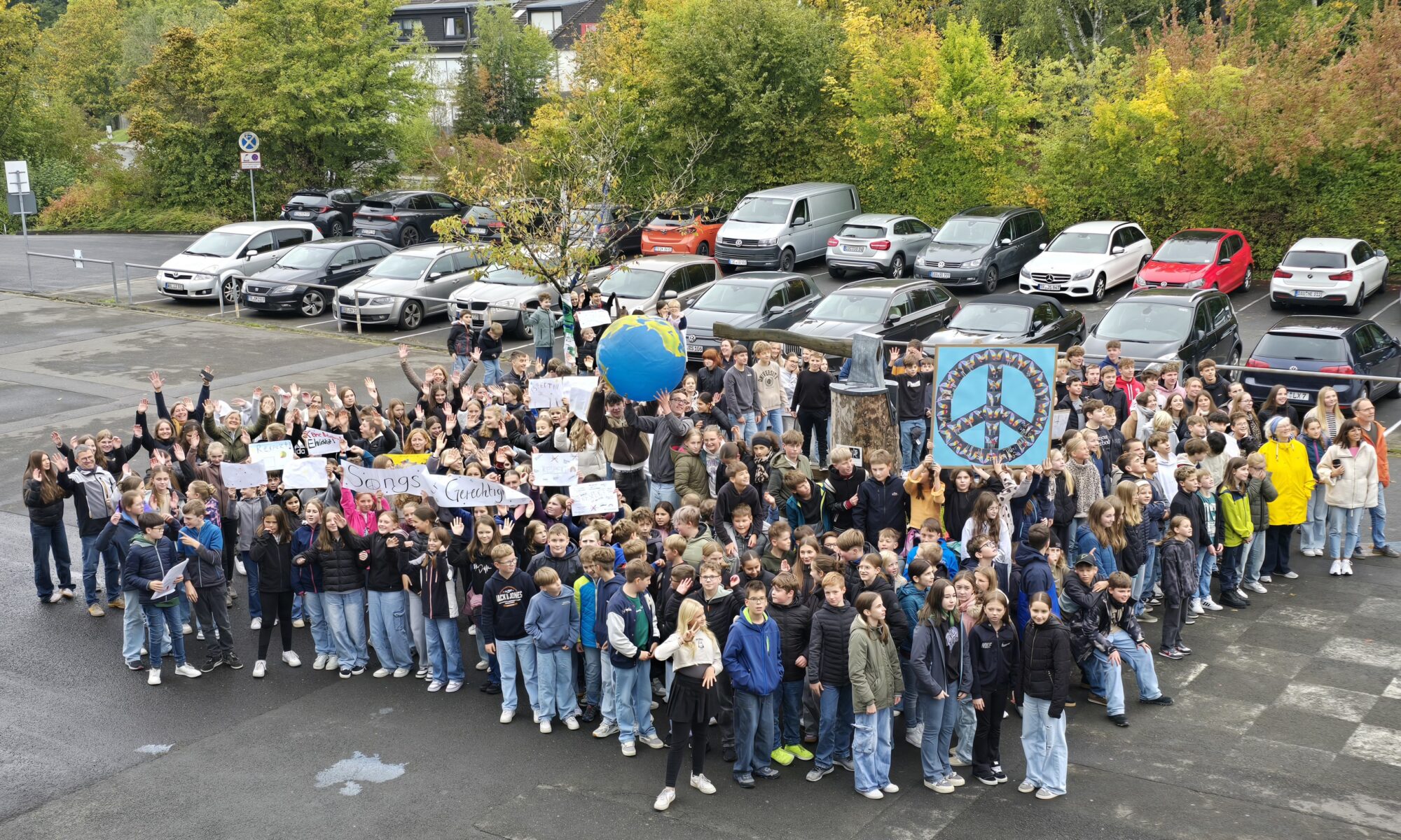 Rund 700 Schülerinnen und Schüler des Geschwister Scholl Gymnasiums, der St. Laurentiusschule und der Drei-Maare-Realschule plus Daun reihten sich von der Wehrbüschkapelle bis zum Mahnmal auf dem Schulhof des GSG nebeneinander auf und gaben dabei eine große Weltkugel weiter. Die Glocken der Dauner Kirchen gaben um 10.30 das Startzeichen, dann reichten sich die Jugendlichen die Hand zur Menschenkette und die Weltkugel rollte