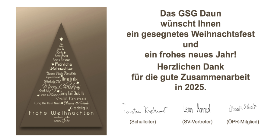 Das GSG ist in den Ferien (22.12. 2025-07.01.2026) per E-Mail erreichbar.